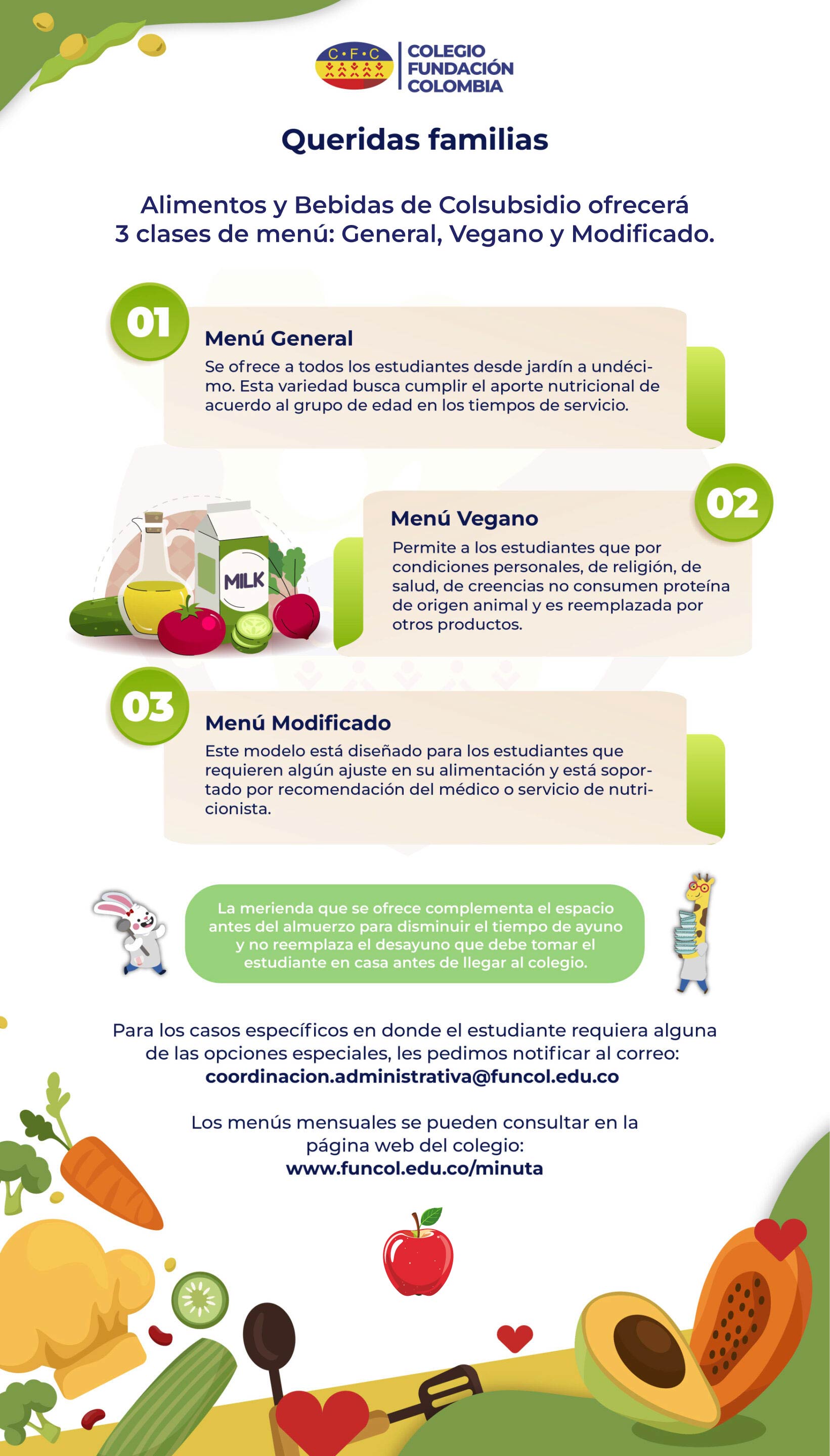 El Colegio Fundación Colombia ofrece en el servicio de restaurante escolar, una única opción de refrigerio y almuerzo elaborado por un equipo de profesionales que garantizan el servicio diario. A continuación encontrará el menú ofrecido a nuestros estudiantes.